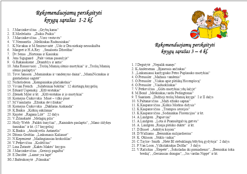 | Rekomenduojamų knygų sąrašas pradinių klasių mokiniams | 2024-01-06 12:26:27 | 141.86 KB | ||