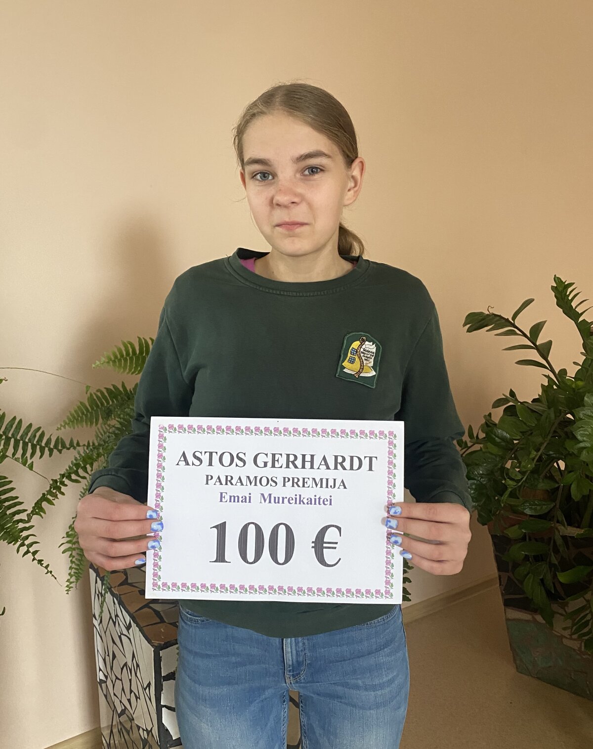 Trečioji premija atiteko 10 klasės mokinei Emai Mureikaitei už aktyvią meninę, sportinę, socialinę, pilietinę veiklą ir mokyklos garsinimą.