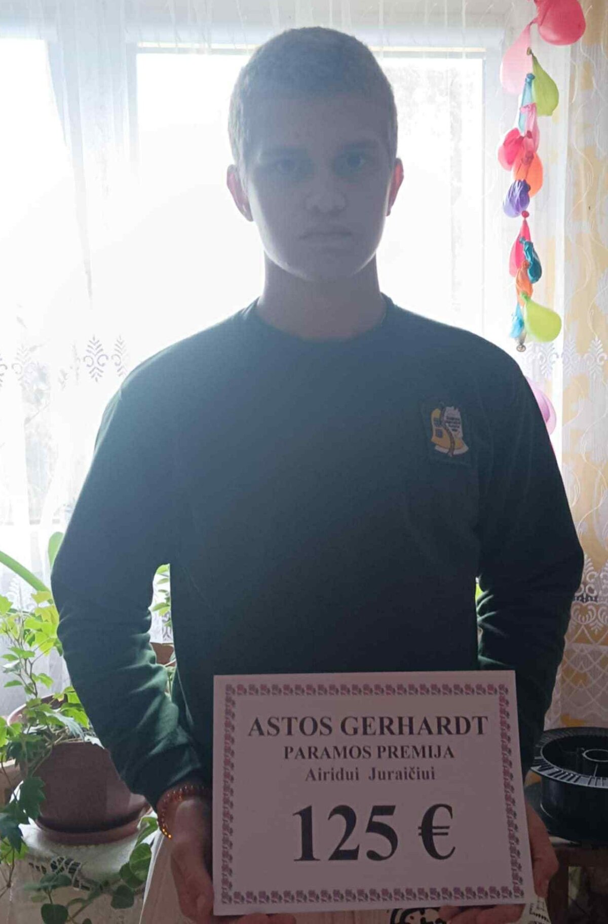 Baigiantis 2024-2025 mokslo metams mokykloje įteiktos 3 buvusios mūsų mokyklos mokinės Astos Gerhardt paramos fondo premijos. Šios premijos paskirtos antrąjį kartą, laikantis Astos Gerhardt inicijuotos paramos premijos skyrimo nuostatų. Dvi premijos po 125 eurus atiteko 10 klasės mokiniams Airidui Juraičiui ir Kostui Sakalauskui už mokyklos baigimą aukščiausiu mokymosi pasiekimų vidurkiu.