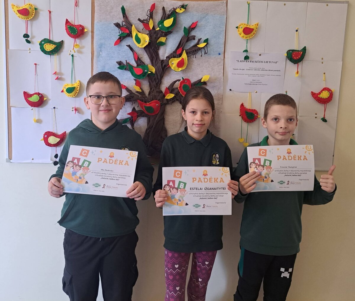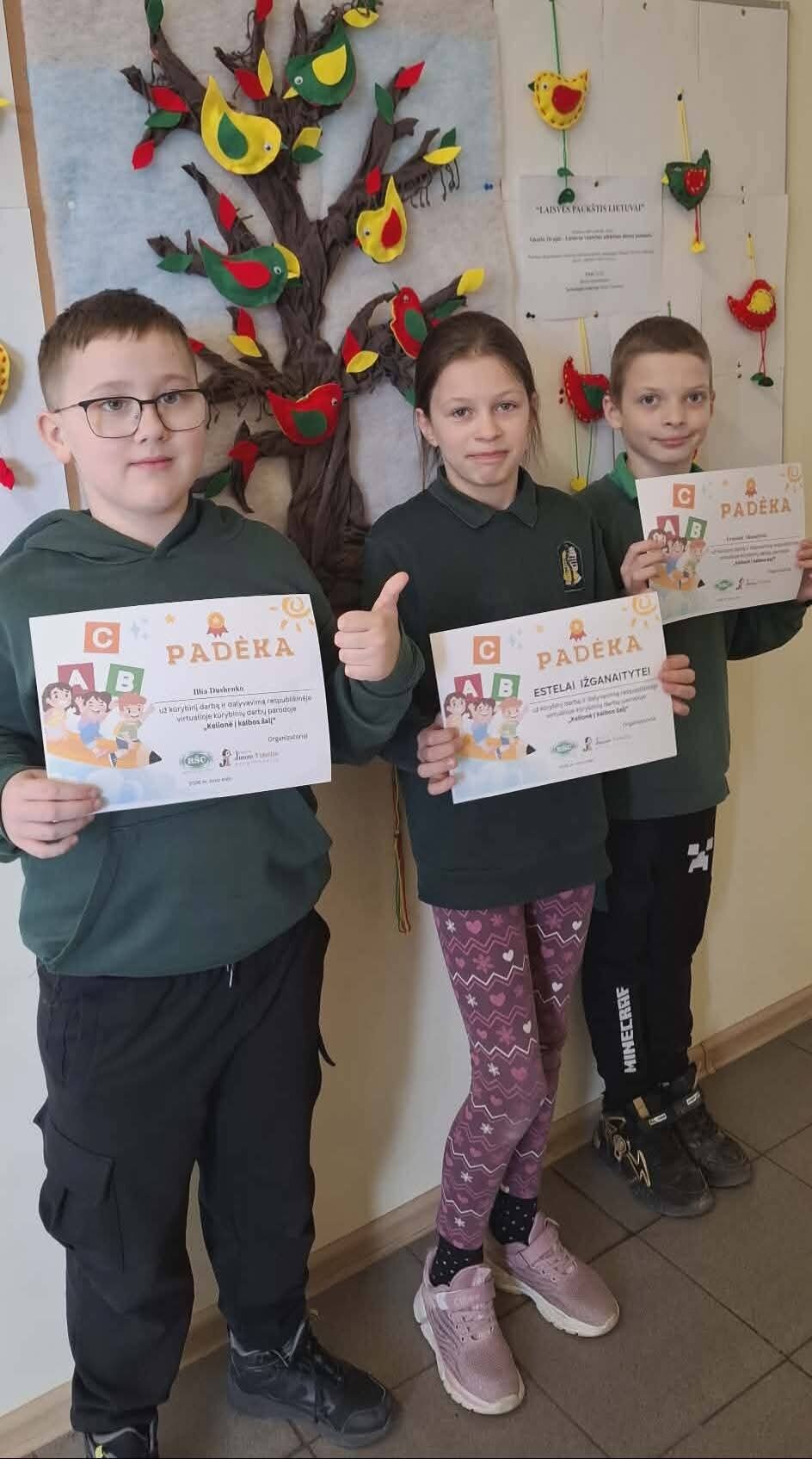 Kovo 16 d. 3 kl. ERNESTAS SKAISGIRYS ir ILLIA DUSHENKO bei 4 kl. ESTELA IŽGANAITYTĖ džiaugėsi gautomis padėkomis, nes vasario mėnesį parengė ir pristatė kūrybinius darbelius respublikinei virtualiai kūrybinių darbų parodai „Kelionė į kalbos šalį“.