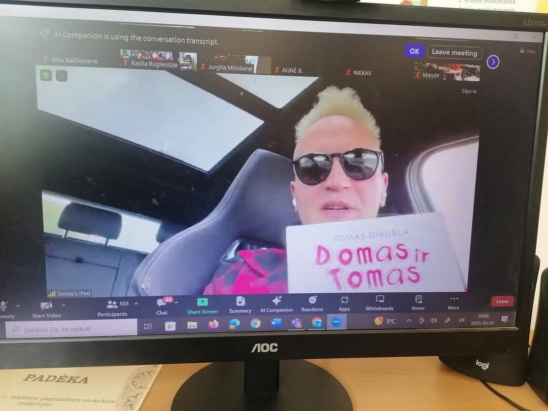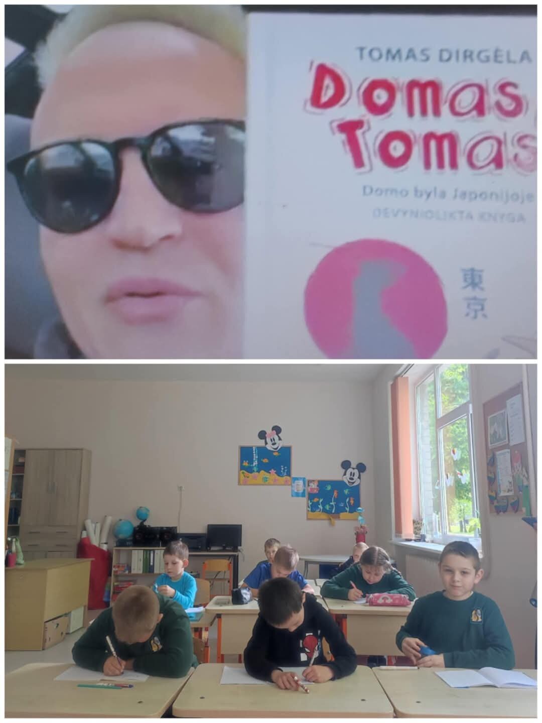 Šių metų gegužės 7 dieną, minėdami spaudos atgavimo, kalbos ir knygos dieną, 1, 2, 7 klasių mokiniai su mokytojomis dalyvavo nuotoliniame susitikime su vienu populiariausių šių laikų lietuvių vaikų rašytoju – Tomu Dirgėla. Susitikime dalyvavo mokiniai iš įvairių Lietuvos mokyklų. Tomas Dirgėla, žinomas dėl savo smagių, nuotykių kupinų ir vaikams artimų istorijų. Susitikimo pradžioje rašytojas pasakojo apie tai, kaip prasidėjo jo, kaip rašytojo, kelias, pasidalijo savo kūrybine kelione, kasdienybe bei įkvėpimo šaltiniais, parodė naujai išleistą knygą. Vaikai buvo labai aktyvūs – jie rašytojui uždavinėjo įvairiausių klausimų: nuo to, kokia jo mėgstamiausia knyga, iki to, ar jis bijo tamsos arba ar yra kada nors parašęs knygą per vieną dieną. Renginys buvo kupinas juoko, klausimų ir įkvėpimo – tikra literatūrinė šventė vaikams ir jų mokytojams. Šis nuotolinis susitikimas su Tomu Dirgėla ne tik praplėtė vaikų žinias apie rašytojo profesiją, bet ir padrąsino svajoti bei kurti.