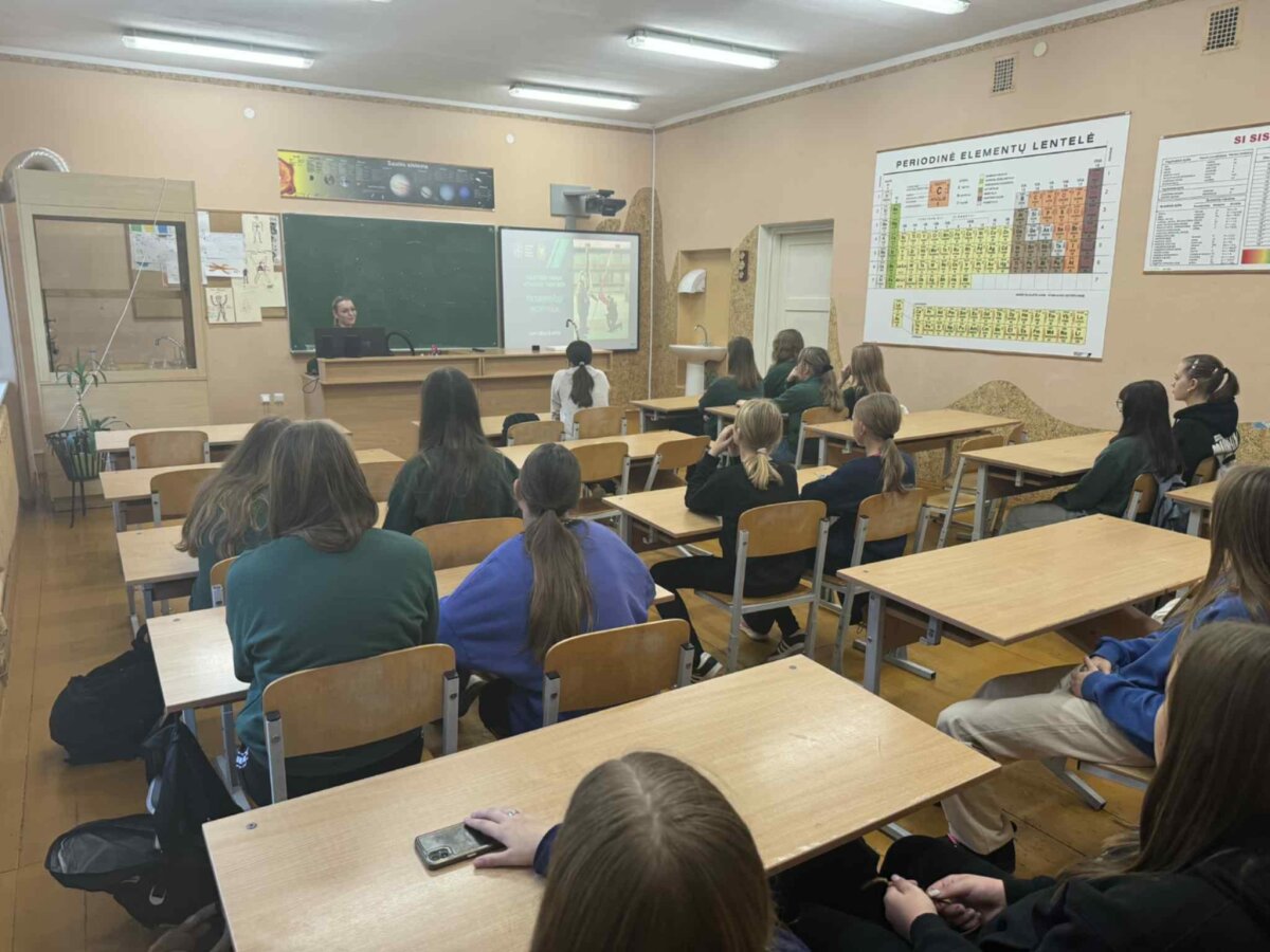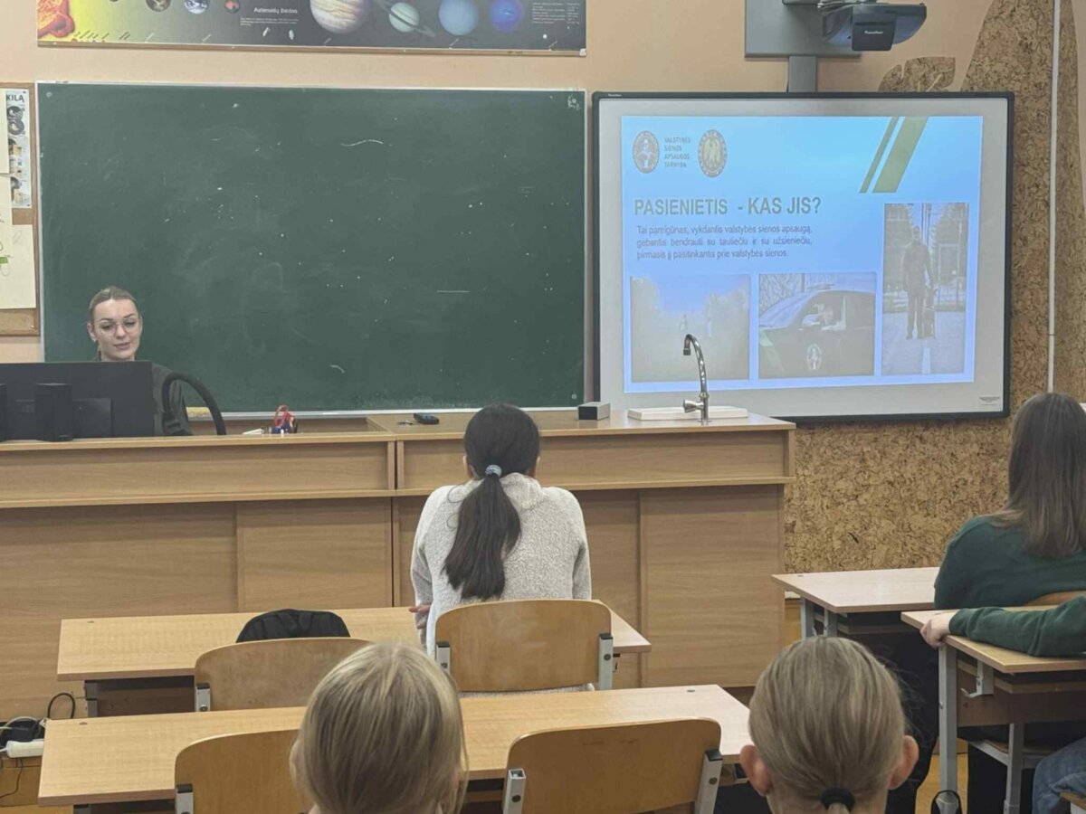 Spalio 10 dieną mokykloje lankėsi pasienietė Gabrielė Žemaitytė, kuri baigusi Valstybės sienos apsaugos tarnybos Pasieniečių mokyklą. Mergina dalijosi savo pašaukimo ir kelio į pasieniečių profesiją patirtimi, kodėl ji rinkosi šią specialybę ir kokios yra galimos karjeros galimybės. Gabrielė papasakojo apie pagrindines pasieniečių funkcijas: kaip veikia pasienio kontrolė, ką tiksliai atlieka pareigūnai, dirbantys pasienio užkardose, bei kaip randami ir tikrinami netikri dokumentai (pavyzdžiai kaip identifikuoti netikrą pasą ar asmens tapatybės kortelę). Supažindino su Pasieniečių mokyklos mokymosi sistema: kaip organizuojamas mokymasis, kokie kursai ir praktika laukia studentų, kuo skiriasi teorija nuo praktikos, ką daro merginos pareigybės metu. Ji pristatė kinologo specialybę ir paaiškino, kuo skiriasi kinologas nuo paprasto pareigūno, kodėl ne visi pareigūnai gali turėti šunis, bei ką daro tarnyboje dirbantys šunys, kokios užduotys tenka šunims pareigūnams, ką šie šunys aptinka ir kaip vyksta jų paruošimas bei kasdienybė tarnyboje.